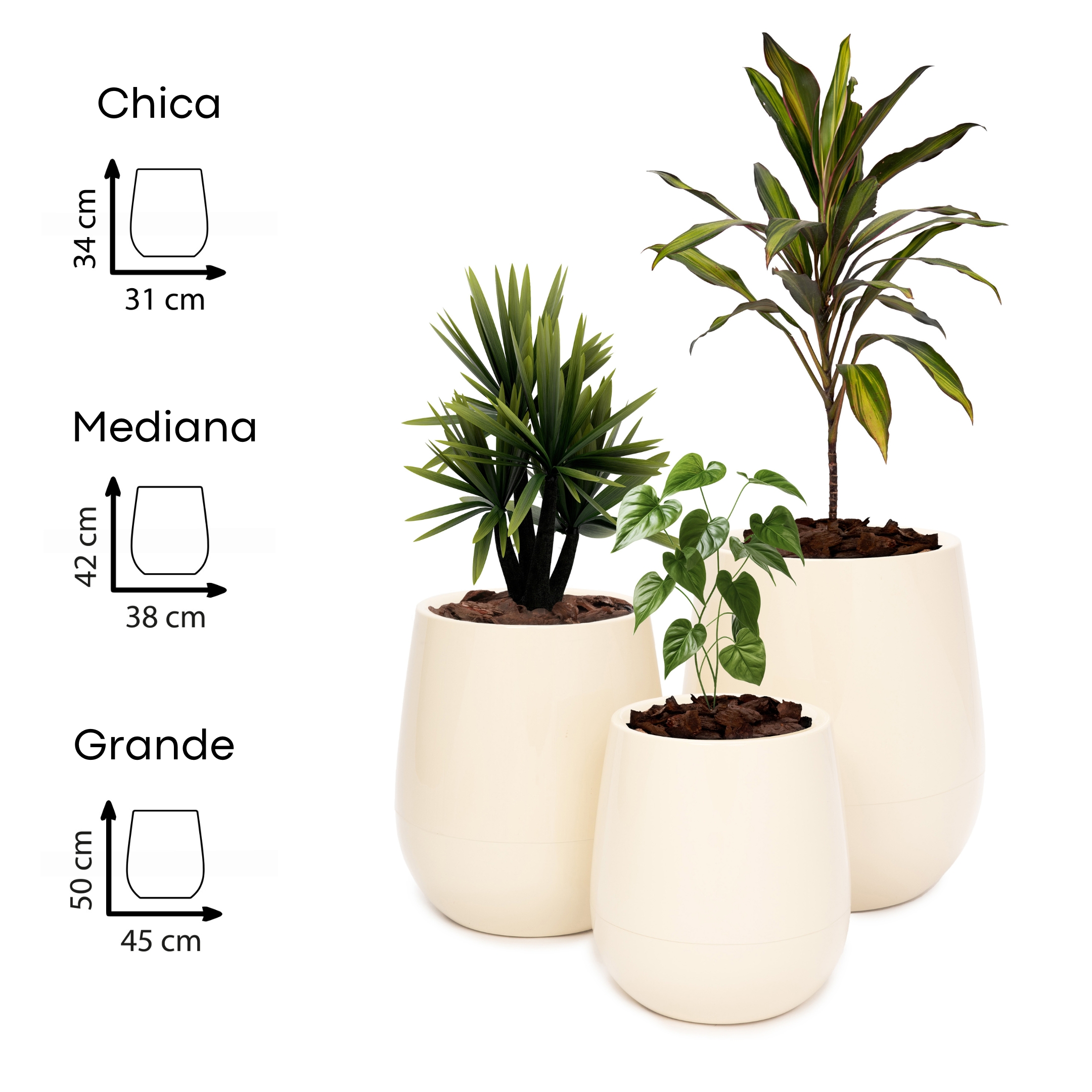 Incluye 3 unidades de macetas Uovo Autorriego Beruplast en tamaños chico, mediano y grande en color marfil.